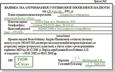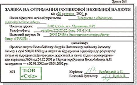 2.Копия поручения (распоряжения) (если поручение было дано в письменной форме) руководителя на получение денежных средств в инвалюте на командировку или на эксплуатационные затраты в кассе обслуживающего предприятие банка. Этот документ, если он составляется письменно, имеет произвольную форму (см. рис.).