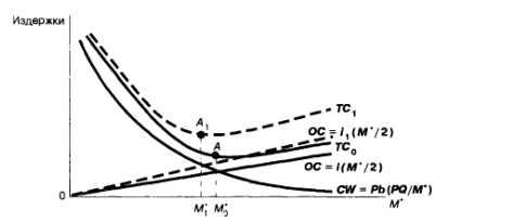 Таким образом, перед домашним хозяйством встает следующая дилемма: чем выше М, тем реже оно обращается в банк, но тем больше потери процентов в течение месяца. Домашнее хозяйство может минимизировать издержки посещения банка путем одного масштабного изъятия средств в начале месяца, что даст ему все денежные средства, необходимые для расходования в течение месяца. Но такая большая сумма М также максимизирует проценты, которые домашнее хозяйство теряет за этот месяц. Действительно, не имея средств на сберегательном счете, домашнее хозяйство вообще не получит процентов.