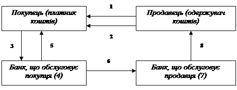 1 – продавець разом із супроводжуючими документами передає товар покупцеві; 2 – покупець (чекодавець) виписує і передає чек продавцю (чекодержателю); 3 – продавець пред'являє чек у банк, що його обслуговує; 4 – банк продавця направляє чек для оплати в банк, що обслуговує покупця; 5 – банк платника списує зазначену у чеку суму коштів з рахунка покупця, на якому вона була попередньо депонована; 6 – банк платника повідомляє свого клієнта про списання коштів; 7 – банк платника переказує банку постачальника відповідні кошти; 8 – банк продавця зараховує кошти на рахунок свого клієнта: 9 – банк продавця повідомляє свого клієнта про зарахування коштів на його рахунок.