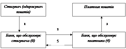 1 – стягувач коштів виписує і подає до банку, що його обслуговує, платіжну вимогу до платника, супровідні документи і реєстр платіжних вимог; 2 – банк стягувача надсилає платіжну вимогу, супровідні документи і реєстр платіжної вимоги до банку платника; 3 – банк платника повідомляє свого клієнта про надходження платіжної вимоги; 4 – на основі перевіреної платіжної вимоги банк списує вказану у ній суму з рахунку платника; 5 – з банку платника надходять документи до банку одержувача коштів стосовно перерахування коштів до нього; 6 – банк одержувача зараховує вказану суму на рахунок одержувача коштів.