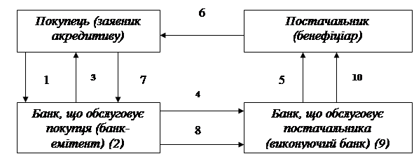 1 – покупець після укладання договору про поставку товарів доручає банку-емітенту відкрити акредитив; 2 – банк-емітент відкриває акредитив; 3 – банк-емітент сповіщає покупця провідкриття акредитива; 4 – банк покупця повідомляє банк постачальника про відкриття акредитива постачальнику на певну суму; 5 – банк постачальника сповіщає свого клієнта про відкриття акредитива; 6 – постачальник відвантажує товар покупцю; 7 – покупець повідомляє банк-емітент про виконання умови акредитива, тобто надає наказ на розкриття акредитива; 8 – банк покупця переказуєбанку постачальника суму коштів з акредитива; 9 – банк постачальника зараховує кошти на рахунок постачальника;10 – банк постачальника повідомляє про зарахування коштів свого клієнта.