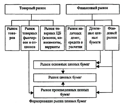Рынок ценных бумаг - это составная часть рынка любой страны, на котором осуществляется купля-продажа ценных бумаг. Основой его являются товарный и финансовый рынки (Рисунок).