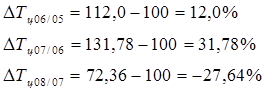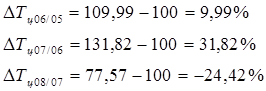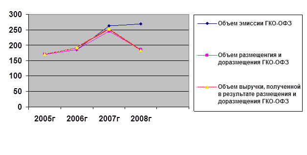 Объем эмиссии государственных ценных бумаг увеличивался в среднем на 18,91%, или на 36,3 млрд. руб. за год. В 2008г, в связи с финансовым кризисом, объем размещения и доразмещения государственных ценных бумаг по номиналу уменьшился на 59,9 млрд. руб., т.е. сократился на 24,42% по сравнению с показателем 2007г. Объем выручки, полученной в результате размещения и доразмещения ГКО-ОФЗ, увеличивался в среднем на 2,21% или на 3,9 млрд. руб. за год (в приведенном трехлетии). В 2008г, в связи с мировым финансовым кризисом, объем выручки резко уменьшился на 70 млрд. руб., т.е. сократился на 27,64% по сравнению с показателем 2007г.