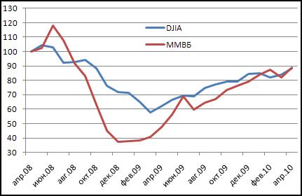Российский фондовый индекс ММВБ в сравнении c американским индексом DJIA. В процентах от значений апреля 2008 года