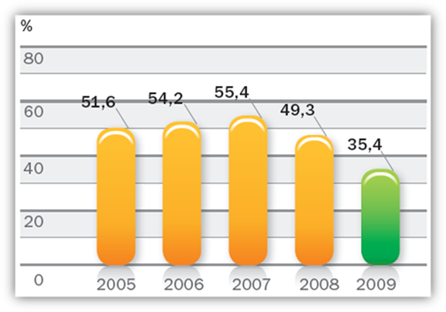 Опережающий рост операционных доходов до резервов и контроль за расходами обусловил снижение в 2009 году показателя отношения операционных расходов к операционному доходу до резервов до 35,4% (в 2008 году 49,3%).