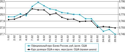 В рассматриваемый период Банк России в целях сглаживания резких колебаний валютного курса перешел к операционному ориентиру, основанному на использовании корзины из евро и доллара США вместо применявшейся до этого привязки рубля к одной валюте - доллару США. В результате волатильность динамики курса евро к рублю в феврале уменьшилась по сравнению с декабрем на 15% (в указанные месяцы значения волатильности курса евро к доллару США были сопоставимыми), в то время как волатильность изменения курса доллара США к рублю выросла всего на 4%.