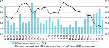В динамике курса американской валюты к рублю в рассматриваемый период можно выделить два этапа. В первой декаде февраля 2005 года на внутреннем валютном рынке наблюдались разнонаправленные колебания курса доллара США к рублю при отсутствии явно выраженной тенденции к его росту или снижению. Однако ослабление доллара США к ведущим мировым валютам на фоне публикации 10 февраля негативных данных о состоянии экономики США, а 22 февраля - заявления Банка Кореи о планируемом изменении структуры валютных резервов привело к масштабному открытию коротких позиций на внутреннем валютном рынке и последующему снижению курса американской валюты к рублю.