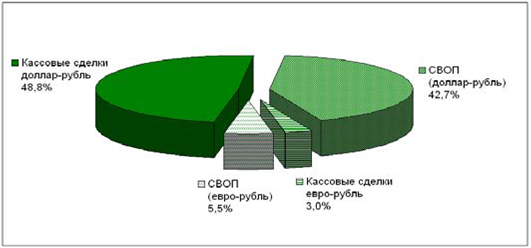 Среднедневной объем торгов европейской валютой снизился на 46,7% до 715,2 млн. евро в день, или 6,9% объема биржевых торгов. Структура операций не претерпела существенных изменений.