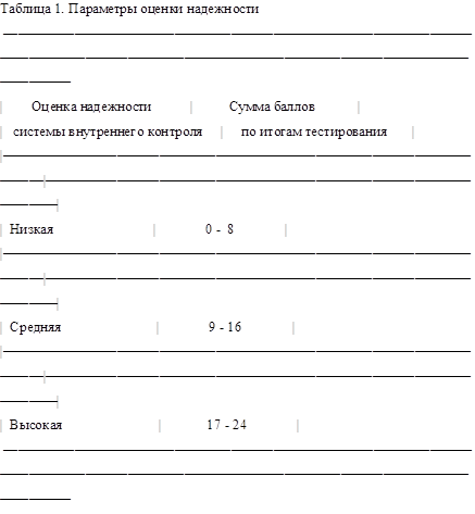 Общий итог подводится по всем разделам. Ориентируясь на рекомендуемые параметры оценки надежности системы внутреннего контроля (табл. 1) и сумму баллов, полученную по итогам тестирования, оценка может быть определена как "низкая", "средняя" или "высокая".