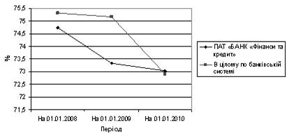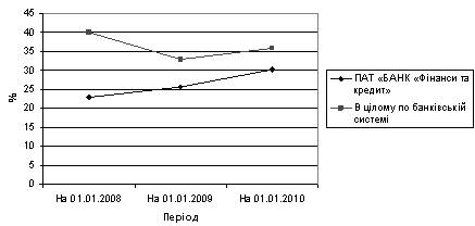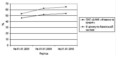 Оцінка діючої системи управління ліквідністю в ПАТ "Банк "Фінанси та Кредит" була здійснена на основі аналізу розривів активів та пасивів з відповідними строками погашення (ГЕП-аналіз); дотримання встановлених обов’язкових економічних нормативів ліквідності, а також з використанням коефіцієнтного методу. Проведений нами аналіз ліквідності банку "Фінанси та Кредит" за останні три роки (2007-2009 рр.) дає підстави для наступних висновків: ризик ліквідності в банку знаходиться на достатньому рівні, але при цьому треба відзначити, що він є цілком контрольованим з боку менеджменту банку. Про це свідчить ГЕП-аналіз-кумулятивний розрив між активами та пасивами значно перевищує норму в 10% (станом на 01.01.2010 р. кумулятивний розрив складає 24,91%), а також значення обов’язкових економічних нормативів ліквідності, які перевищують нормативні вимоги Національного банку України. Результати ГЕП-аналізу активів та пасивів банку свідчать про негативну тенденцію ліквідності, яка спостерігалась протягом 2007 року та продовжувалась в 2008 р. та пов’язана із поступовим покращенням збалансованості структури активів та пасивів та зменшенням ризику незбалансованої ліквідності в 2009 році. Такі зміни були зумовлені, в першу чергу затвердженням в 2009 році нової стратегії та тактики на всіх організаційних рівнях, яка забезпечила контроль збалансованості обсягів активно-пасивних операцій, а також покращенням загальекономічної ситуації в країні. В підтриманні ліквідності в кризовий період значну роль зіграли кошти рефінансування, які надавав Національний банк України. Стабілізація ліквідності банку пов’язана ще із стабілізацією ситуації на вітчизняному ринку депозитів – в другому півріччі 2009 року припинився відтік депозитів з банківської системи.