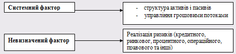 - балансовий ризик ліквідності -тобто ризик того, що банк у певний момент часу не зможе виконати свої зобов’язання за рахунок наявних ліквідних активів унаслідок неадекватної структури балансу та незбалансованості між обсягами і термінами погашення активів і пасивів;