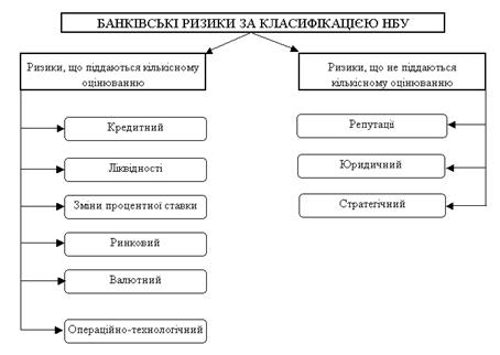 1. ФІНАНСОВІ: втрата ліквідності; неплатоспроможність; банкрутство; зниження доходності операцій; втрата фінансової незалежності; погіршення фінансового стану клієнтів чи партнерів; підвищення вартості ресурсів; 2. ОРГАНІЗАЦІЙНІ: недостатнє кадрове забезпечення; низький рівень професіоналізму; недосконалість систем прийняття управлінських рішень; неадекватна організаційна структура банку; недостатній контроль; 3. ФУНКЦІОНАЛЬНІ: операційна діяльність; технологічні збої; інноваційна діяльність; недосконалі системи безпеки; недостатня або недостовірна інформація; юридичні помилки; неправильно обрана стратегія розвитку; недиверсифікована клієнтська база банку; концентрація кредитного портфелю; |