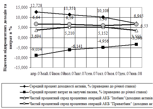 | Чистий процентний спред процентних операцій АКБ "Іпобанк"(доходних активів платні пасиви),% | 0,007 | 3,694 | 5,210 | 5,152 | 3,555 |