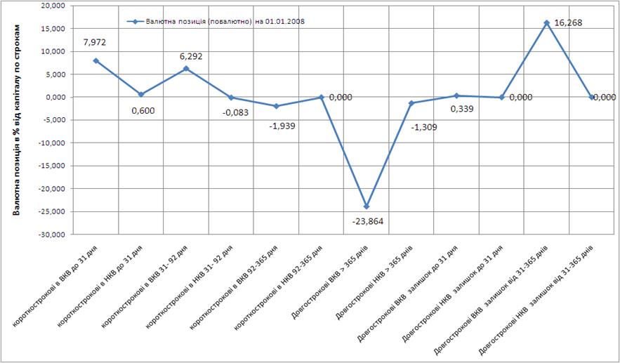 Рис.Г.3. Аналіз ефективності управлінням часовими гепрозривами в короткострокових активах та пасивах ВАТ КБ “Іпобанк” станом на 01.01.2008 року (повалютно)