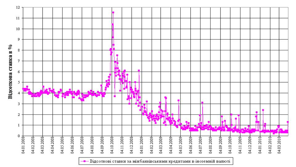 Рис.Л.2 Динаміка середньозважених ставок міжбанківських кредитів в іноземній валюті в докризовий, кризовий та післякризовий періоди наслідків світової фінансової кризи у 2008 - 2009 рр.