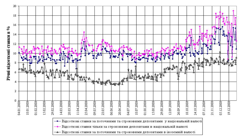 Рис.Л.3 Динаміка середньозважених ставок депозитів в національній і іноземній валюті в докризовий та кризовий періоди наслідків світової фінансової кризи у 2008 році