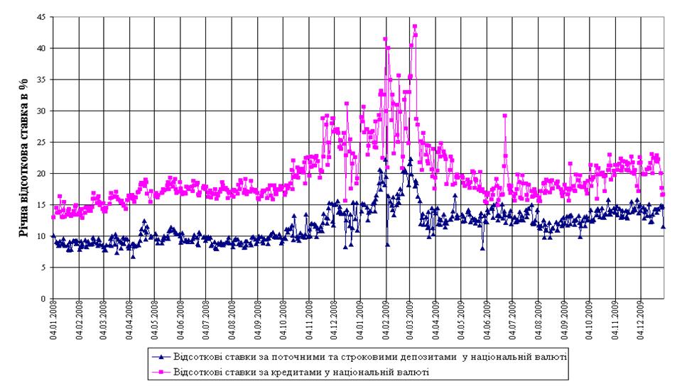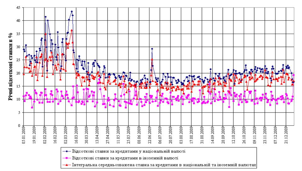 Рис.Л.5 Динаміка середньозважених ставок кредитів в національній і іноземній валюті в докризовий та кризовий періоди наслідків світової фінансової кризи у 2008 році