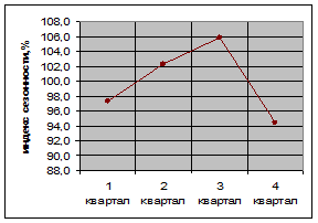 3.По квартальным уровням рассчитаем индексы сезонности грузоперевозок, построим сезонную волну.