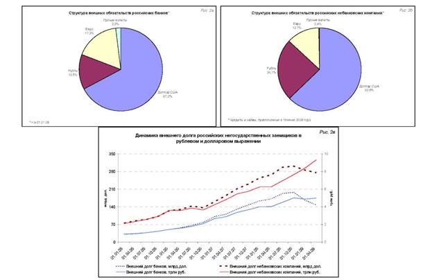 В последние месяцы 2008 г. и в начале 2009 г. существенное значение приобрел еще один фактор, ухудшивший положение российских заемщиков, – снижение номинального курса рубля к ведущим иностранным валютам. Поскольку основной объем внешних заимствований российских компаний и банков осуществлялся в иностранных валютах, а многие российские заемщики привлекали валютные заимствования для финансирования операций по приобретению рублевых активов, долговая нагрузка на российские компании и банки в этот период существенно увеличилась, возросли их валютные риски. Более 60% внешних обязательств российских заемщиков приходилось на кредиты и ценные бумаги, номинированные в долларах США. Поэтому источником потенциальных убытков российских заемщиков было не только ослабление рубля, но и имевшее место во второй половине 2008 г. укрепление доллара к другим ведущим мировым валютам (рис. 2).