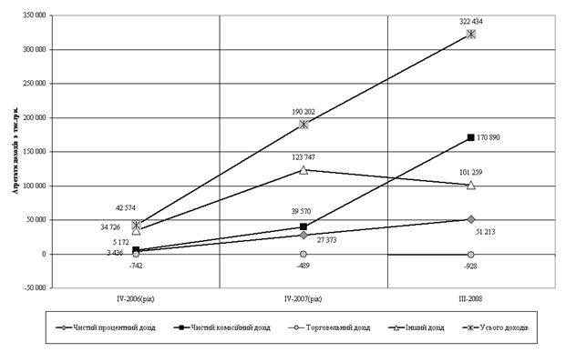 Рис.2.5 Динаміка доходів ТОВ „Банк Ренесанс капітал” за 2006 -2008 роки