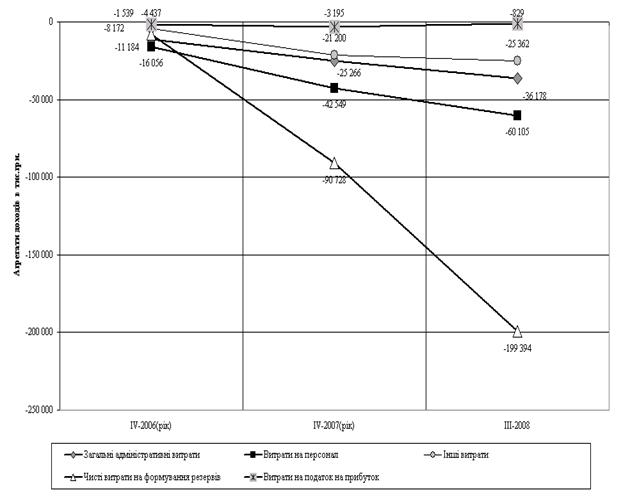 Значне збільшення відрахувань у резерви обумовлено збільшенням обсягів кредитування фізичних осіб в 2007 -2008 роках та великим ризиком без заставного кредитування (рис.2.6).