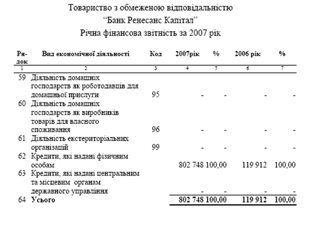 ТОВ «Банк Ренесанс Капітал» здійснює основну свою діяльність по індивідуальному обслуговуванні приватних клієнтів в частині надання їм споживчих кредитів цільових та кредитів на загальні потреби. Виходячи з цього, структура контрагентів Банку є наступною: