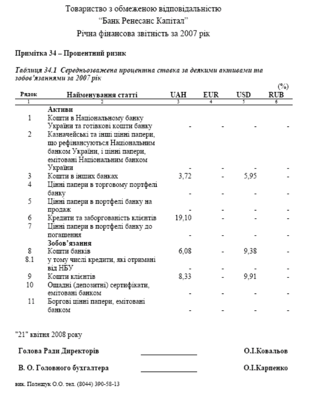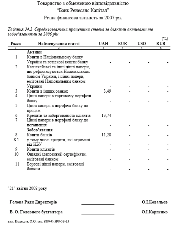 Процентна маржа між ставками за залученими та розміщеними кошта-ми протягом 2007 року була позитивною. Так середні процентні ставки за 2007 рік були наступними, %: