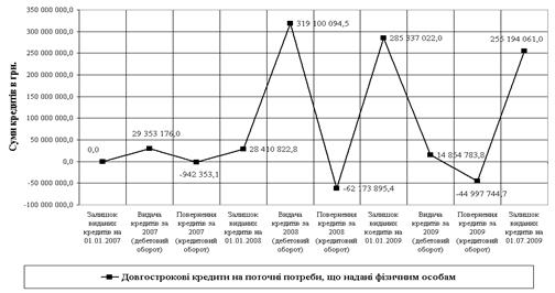 Рис.Л.2. Динаміка оборотно-сальдового обороту довгострокового кредитування на поточні потреби за активним балансовим рахунком № 2203 в ПАТ „Кредит Європа банк” у 2007 – 2009 роках (Систематизовано та побудовано автором самостійно)