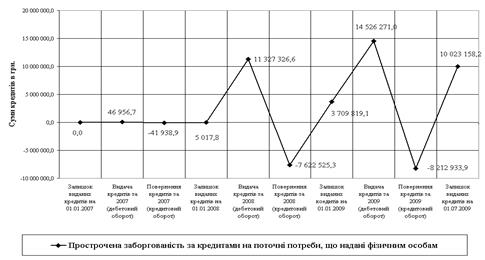 Рис.Л.3. Динаміка оборотно-сальдового обороту прострочених кредитів на поточні потреби за активним балансовим рахунком № 2207 в ПАТ „Кредит Європа банк” у 2007 – 2009 роках (Систематизовано та побудовано автором самостійно)