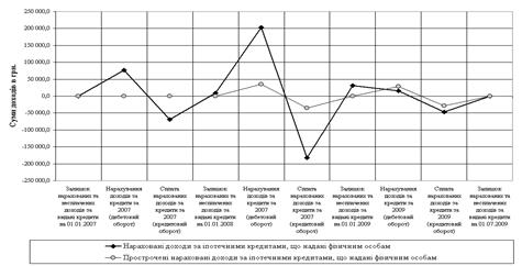 Рис.Л.4. Динаміка оборотно-сальдового обороту нарахування, прострочення та сплати доходів за кредити на поточні потреби за активними балансовими рахунками № 2208, 2209 в ПАТ „Кредит Європа банк” у 2007 – 2009 роках