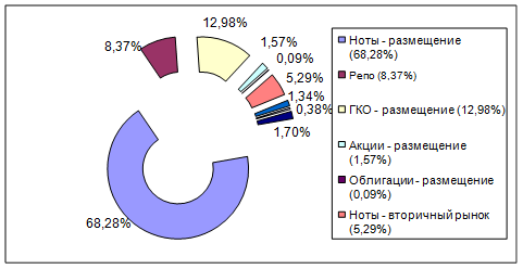 Из указанного объема 111 378 553,08 маната пришлось на долю размещений нот Национального банка, оборот на вторичном рынке по этому инструменту составил 8 231 490,86 маната. Оборот за январь-март 2005 года на первичном рынке нот составил 34 678 413,38 маната, объем сделок на вторичном рынке по этому инструменту составил 1 999 287,20 маната. Объем размещения ГКО Министерства финансов составил за рассматриваемый период 17 979 132,66 маната, в январе-марте прошлого года операции по ГКО не проводились. Оборот по ГКО на вторичном рынке в январе-марте этого года составил 3 099 369,18 маната. Оборот по репо составил в этом году 14 586 649,73 маната (репо-операции в течение января-марта прошлого года проводились на сумму 7 793 014,23 маната).