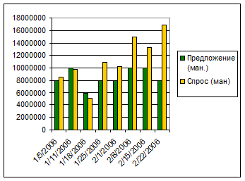 Из указанного объема 68 618 098,58 маната пришлось на долю размещений нот Национального банка, оборот на вторичном рынке по этому инструменту составил 5 315 094,82 маната. Оборот за январь-февраль 2005 года на первичном рынке нот составил 19 845 435,48 маната, объем сделок на вторичном рынке по этому инструменту составил 803 133,60 маната. Объем размещения ГКО Министерства финансов составил за рассматриваемый период 13 048 276,36 маната, в январе-феврале прошлого года операции по ГКО не проводились. Оборот по ГКО на вторичном рынке в январе-феврале этого года составил 1 701 228,08 маната. Оборот по репо составил в этом году 8 408 789,32 маната (репо-операции в течение января-февраля прошлого года проводились на сумму 1 988 785,39 маната). В секторе корпоративных бумаг на долю размещений акций пришлось 1 575 340 манатов (в январе-феврале 2005 года этот показатель составлял 1 856 711 манатов. Оборот на вторичном рынке по акциям составил 1 350 431 манатов (аналог по прошлом году – 598 960,96 маната. Объем размещения корпоративных облигаций за этот период составил 96 562,11 маната, оборот на вторичном рынке облигаций составил 385 388,95 маната (в январе-феврале прошлого года операции по корпоративным облигациям проводились только на вторичном рынке – на сумму в 337 411,03 маната).