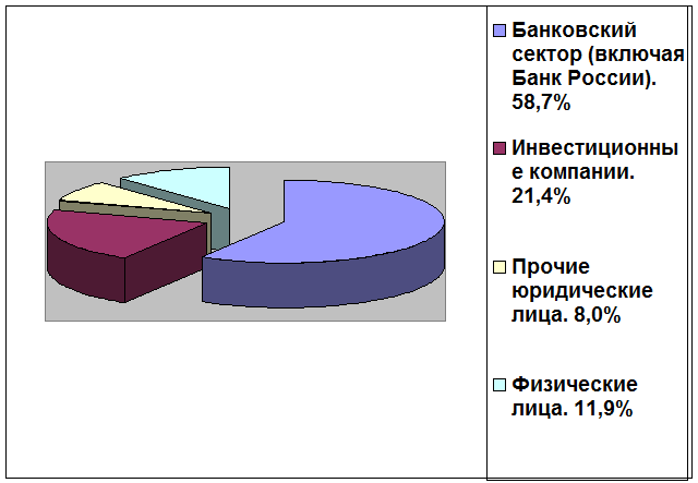 Из диаграммы видно, что наибольший удельный вес в структуре акционеров занимает банковский сектор, также немалую роль играют инвестиционные компании и физические лица, соответственно 21,4 и 11,9%. Поэтому основная управляющая роль находится в руках банковского сектора, куда также входит и Центральный банк РФ.
