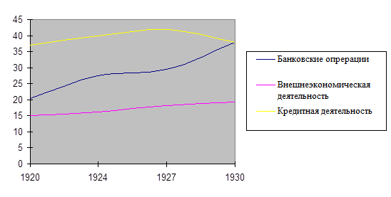 Как видно из таблицы, за пять лет, с 1924 по 1929 г., сеть учреждений Госбанка почти удвоилась. Увеличение сети проходило в основном за счет агентств. Отделения Госбанка открывались лишь в тех уездных городах, где имелась достаточная база для ведения активных банковских операций. В ряде уездных городов такой базы не было, поэтому там открывались агентства, которые осуществляли главным образом вкладные и переводные операции. Ссудные операции агентства производили лишь по поручениям тех отделений или контор , Госбанка, в ведении которых они находились. В 1922-1925 гг. шел процесс организации банков, обслуживающих отдельные отрасли хозяйства, и коммерческих банков. В этот период были организованы: Всероссийский банк потребительской кооперации, реорганизованный в 1923 г. во Всероссийский кооперативный банк; Всеукраинский кооперативный банк; Российский торгово-промышленный банк; Дальневосточный, Северо-Кавказский, Среднеазиатский и Юго-восточный коммерческие банки; Банк по электрификации (Электробанк); 45 коммунальных банков во главе с Цекомбанком; система сельскохозяйственного кредита (Центральный сельскохозяйственный банк ,шесть республиканских банков сельскохозяйственного кредита, 71 общество сельскохозяйственного кредита, свыше 9 тыс. сельскохозяйственных кредитных товариществ) и 286 обществ взаимного кредита.