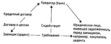 2.3 Уступка требований (цессия) и передача права собственности В практике некоторых стран рыночной экономики в качестве форм обеспечения возвратности кредита наиболее часто применяются уступка (цессия) требований и передача права собственности. Уступка (цессия) – это документ заемщика (цедента), в котором онуступает свое требование (дебиторскую задолженность) кредитору (банку) вкачестве обеспечения возврата кредита. Из рис.1 видно, что договор о цессии дополняет кредитный договор, создавая правовую основу для обеспечения возвратности полученной клиентом банка ссуды. Договор о цессии предусматривает переход к банку права получения денежных средств по уступленному требованию. Стоимость уступленного требования должна быть достаточной, чтобы погасить ссудную задолженность. Банк имеет право воспользоваться поступившей выручкой только для погашения выданного кредита и платы за него. Если по уступленному требованию поступает сумма денежных средств, превышающая задолженность по ссуде, то разница возвращается цеденту.