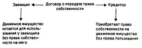заемщик может уступать уже не существующие требования. Кроме уступки индивидуальных требований, например, банки Германии используют общую и глобальную цессии. Общая цессия означает, что заемщик обязуется перед банком регулярно уступать требования по поставке товаров или оказанию услуг на определенную сумму. При этом право банка на получение денежных средств в погашение предоставленного кредита возникает не в момент заключения договора об общей цессии, а с момента передачи в банк требований или списка дебиторов. При глобальной цессии заемщик обязан уступить банку все существующие требования к конкретным клиентам и вновь возникающие в течение определенного периода времени. Этот вид уступки требований считается предпочтительным. При общей и глобальной цессии максимальная сумма кредита составляет 20 – 40% от стоимости уступленных требований. Для того чтобы движимое имущество могло быть в пользовании заемщика и в то же время служить гарантией возврата кредита, используется передача права собственности на него кредитору в обеспечение имеющегося долга.В отличие от заклада при передаче права собственности кредитору (рис.2) вобеспечение долга движимое имущество клиента остается в его пользовании. Это происходит, когда передача ценностей кредитору невозможна и нецелесообразна и если заемщик не может отказаться от использования объекта обеспечения ссуды. Заемщик в данном случае несет ответственность за сохранность оставшихся в его пользовании ценностей и не имеет права самостоятельного распоряжения ими.
