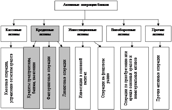 Практикой банковского кредитования накоплен богатый опыт. В настоящее время банковские кредиты имеют многоуровневую классификацию, устоявшуюся нормативно-правовую базу, общие подходы к организации кредитного процесса, определенные этические стандарты поведения участников. С экономической точки зрения в состав кредитных операций также следует включить лизинговые и факторинговые операции, несмотря на то, что нередко их относят к числу посреднических операций.