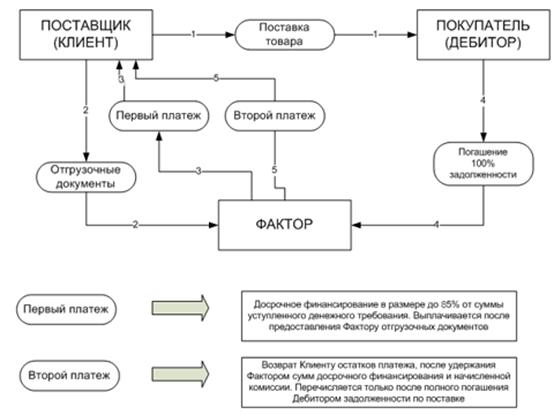 4. По наступлению платежа по договору купли-продажи фактор предъявляет денежное требование к должнику, а должник перечисляет денежные средства в погашении задолженности. Разница между суммой полученной от должника и суммой, ранее перечисленной клиенту в виде финансирования, составляет вознаграждение фактора.
