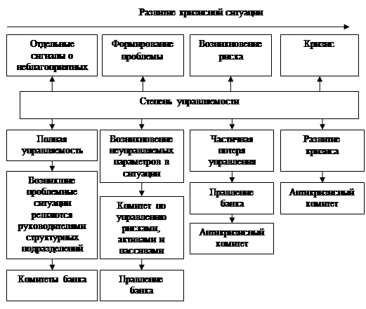 Взаимосвязанными элементами банковского кризис-менеджмента являются цели, принципы, функции, критерии, организационно-правовые, финансово-экономические и методические средства. Все они включены в обеспечивающую и функциональную части системы управления рисками. Обеспечивающая часть состоит из подсистем организационного, методического, нормативного и правового обеспечения. Функциональная часть объединяет функции управления кризисными ситуациями и представляет собой комплекс экономических и организационных методов, обеспечивающих решение задач диагностики финансового состояния банка, контроля и своевременного предупреждения и предотвращения приближающихся кризисных ситуаций, финансового оздоровления и преодоления состояния неплатежеспособности.