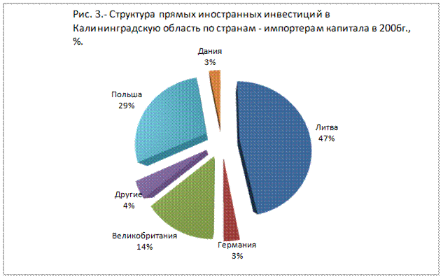 Динамика развития внешнеэкономических связей свидетельствует о постепенном превращении области в крупный центр экспортно-импортных операций. За время действия закона в области сформировался круг предприятий, стабильно выпускающих продукцию, ориентированную на внешний рынок. В 2006 г. прямые иностранные инвестиции в Калининградскую область составили 21,2 млн. долларов США, больше всего – почти половина – поступило из Литвы (9,9млн. долларов США, или 46,8%). На втором месте – Польша (6,2 млн. долларов, или 29,1%) рис.3.
