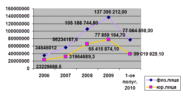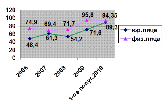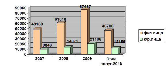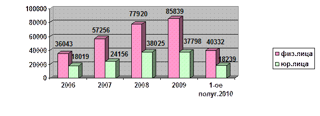 Рисунок И.1 - Сведения о количестве заключенных договоров по добровольному страхованию автотранспортных средств физических и юридических лиц настраховом рынке Республики Беларусь за 2006-1-ое полугодие 2010 годы