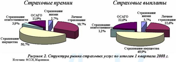 По итогам 1 квартала 2008 года темп роста общего страхования незначительно увеличился с 111,8% годом ранее до 118,1%. Наибольший рост сохраняется в страховании имущества (121% в 1 квартале 2008 года). Личное страхование растет со среднерыночным темпом 118,6%. Страхование ответственности, напротив, сократилось на 3,4%. Данная тенденция отражает усиление контроля со стороны страхового надзора в этом сегменте рынка, так как доля схем в страховании ответственности на российском рынке по-прежнему высока.