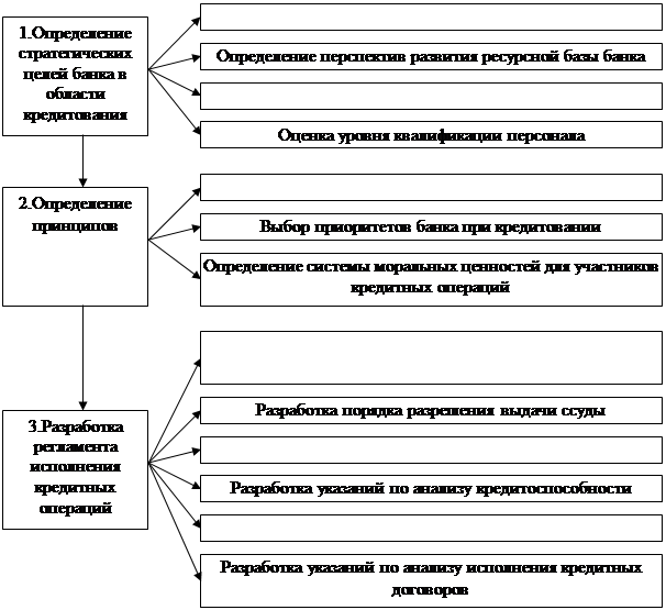 Первый этап формирования политики банка в области кредитования -определение его стратегических целей. После этого банк вырабатывает принципы организации кредитного портфеля и далее, основываясь на выбранных принципах, определяет регламент исполнения кредитных операций. Схематично состав работ, которые выполняются на каждом из перечисленных этапов формирования политики банка в области кредитования, представлен на рисунке 1.