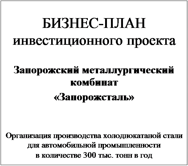 Цель проекта: В соответствии с правительственной программой развития отечественного автомобилестроения в Украине, комбинат «Запорожсталь» разработал проект организации производства 300 тыс. тонн в год холоднокатаной стали для сложной и особо сложной вытяжки, отвечающей требованиям автомобильной промышленности, взамен импортируемой.