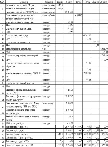 Спільний аналіз помісячних графіків руху грошових коштів за 2007 рік на гривневому та валютному розрахунковому рахунках підприємства варіант №4 з врахуванням вихідних даних по надходженням і витратам підприємства, а також врахуванні надходження коштів від погашення векселів показав, що станом на 01.01.2008 року показники наявності коштів та боргів характеризуються наступним: