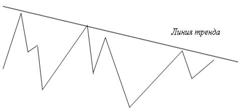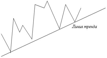 “Бычий”, или возрастающий тренд характеризуется тем, что каждый последующий подъём и впадина на ценовом графике, выше предыдущих (рисунок ниже). Линия, ограничивающая такой тренд снизу называется линией тренда.