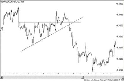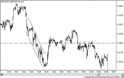 На рисунке, приводимом ниже, изображена линия канала и уровень поддержки величиной в 1.4200 переходящий с течением времени в уровень сопротивления.
