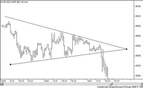 После завершения каждого из треугольников следует ожидать возобновления движения в направлении предшествующего тренда. Момент, когда треугольник закончился, можно определить по следующим критериям: