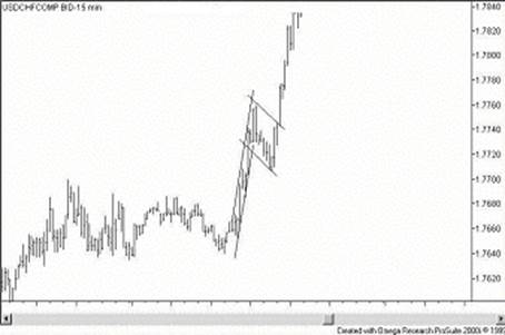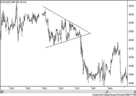 В качестве общей рекомендации к ведению торговли можно заметить, что торговать “внутри” треугольника или любой другой фигуры продолжения нет смысла, потому как шансов потерять деньги при такого рода ценовых колебаниях гораздо больше, чем шансов выиграть. Вступать же в сделку необходимо сразу после окончания фигуры продолжения, когда ожидается резкий подъём или спад цен.