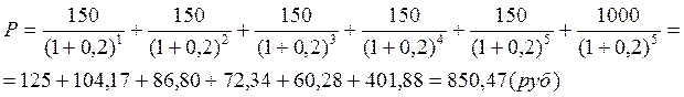 Продается облигация номиналом 1000 руб. Процентная (купонная) ставка составляет 15 % годовых. Выплаты процентов производятся один раз в год. До погашения облигации остается ровно 5 лет. Требуемая норма прибыли (доходность) на инвестиции с учетом риска, соответствующего данному типу облигаций, составляет 20 %. Определить курсовую цену облигации.